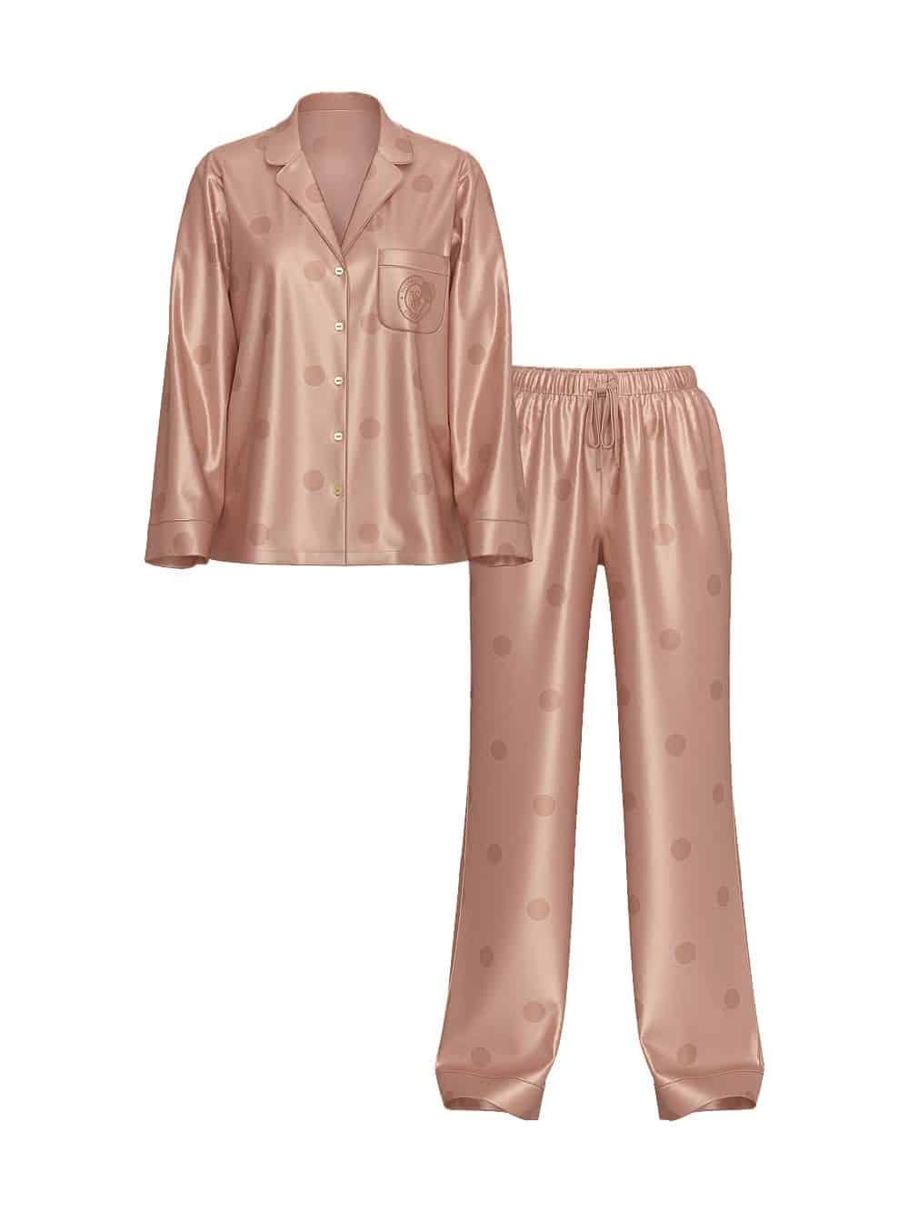 Атласний піжамний комплект із штанів та топа з довгими рукавами, кишенею на грудях, відкладним коміром із розрізами та декоративною окантовкою. Легка, м’яка, як шовк і приємна піжамка, виготовлена з тканини класу люкс, виглядає жіночно та сексуально.