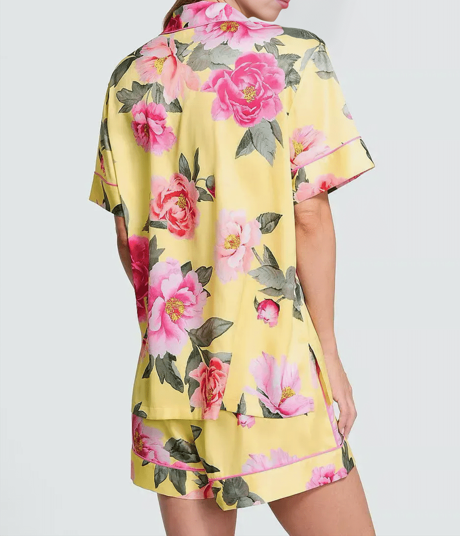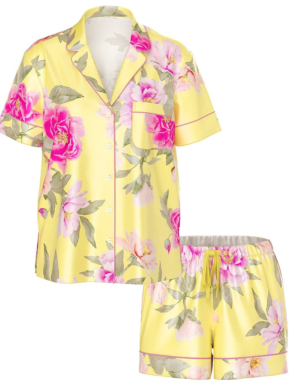 Легка, м’яка, як шовк і приємна піжама з розкішної атласної тканини із застібкою на гудзики, відкладним коміром з розрізами та оздобленням декоративним кантом.